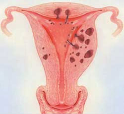 When the lining of the uterus grows into the wall of the uterus, the condition is called adenomyosis. Adenomyosisis often confused with fibroids, which frequently leads to inappropriate treatment. Normally, when the endometrium sheds during a menstrual period the blood is free to drain out through the cervix. When the lining goes into the muscle some of the blood may be trapped. When extensive, this may cause severe cramps and heavy bleeding. This can cause the walls of the uterus to thicken and the uterus to become enlarged. Often an enlarged uterus from adenomyosis is misdiagnosed as being from fibroids. Usually ultrasound or MRI can tell whether a uterus is enlarged from fibroids or from adenomyosis. Many times adenomyosis can be seen at hysteroscopy.